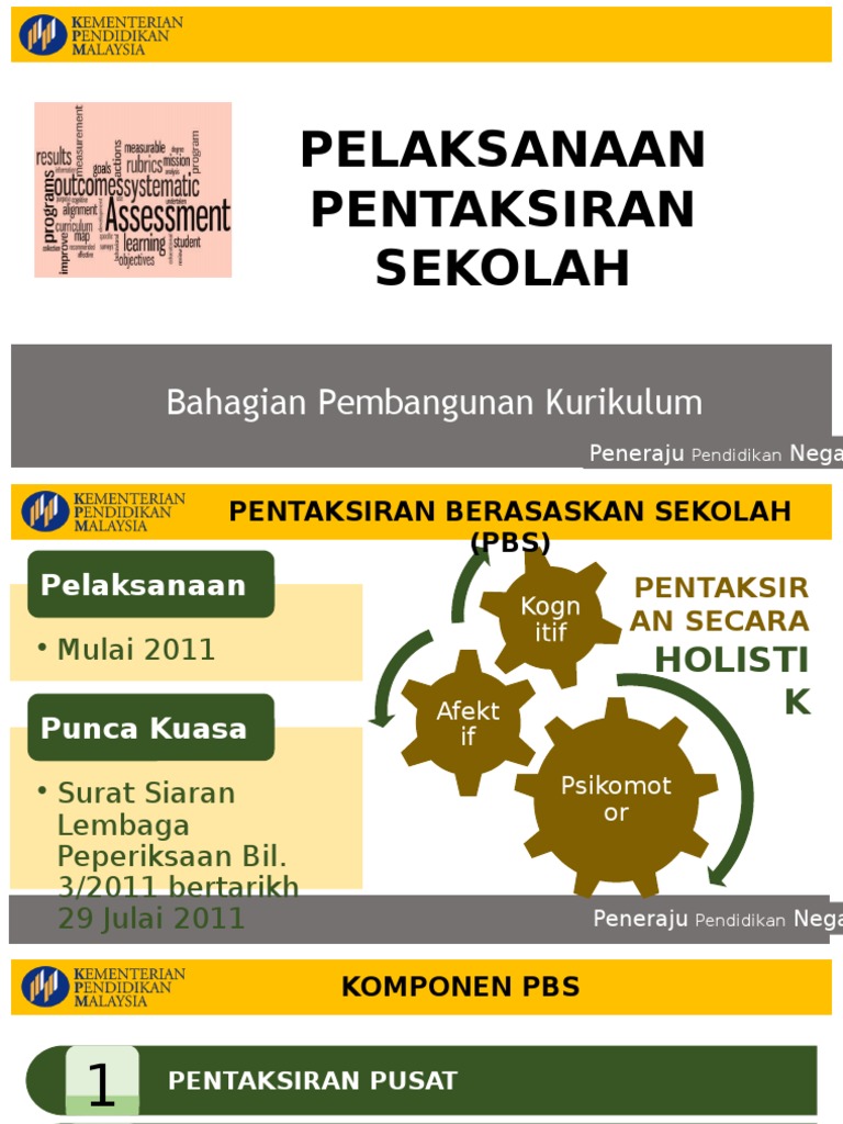 Related : Panduan Pelaksanaan Pentaksiran Sekolah : 1.0 tujuan garis panduan ini bertujuan untuk memberi penjelasan tentang kaedah pelaksanaan pentaksiran bilik darjah (pbd) seiring dengan pemansuhan amalan peperiksaan pertengahan tahun dan akhir tahun bagi murid tahap i di semua sekolah rendah kementerian pendidikan malaysia..
