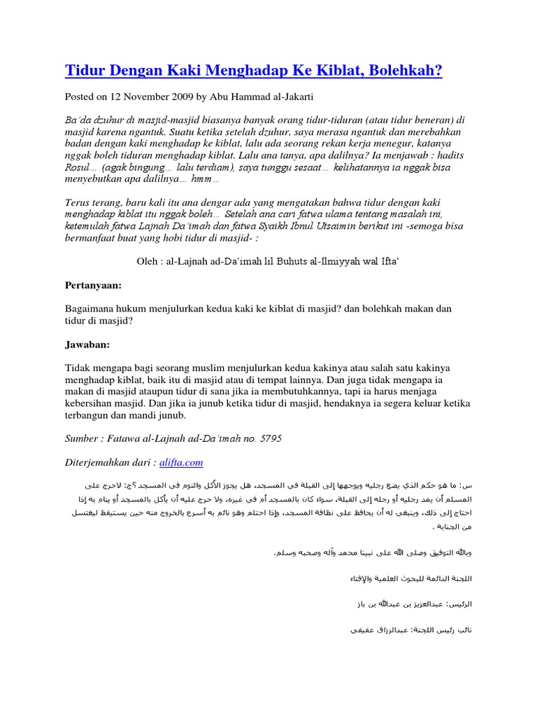 Tidur dengan kaki menghadap ke kiblat. Orang yang berwudu disunahkan untuk menghadap kiblat. Pernahkah anda bertanya mengapa sholat menghadap kiblat? .kaki ke arah kiblat adalah makruh dalam semua keadaan termasuk tidur dan selain daripadanya. Barangsiapa yang terlewat shalat karena tidur atau karena lupa, maka ia wajib shalat ketika ingat hr.